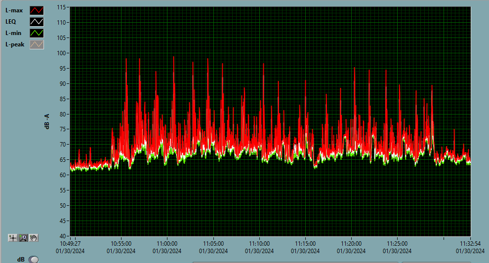 - Decibels are on the vertical axis and time is along the bottom.